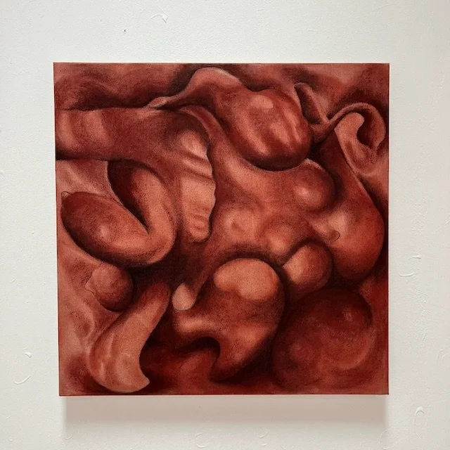 Since graduating she has established a robust practice finding imagery through experimental and investigative processes. This exhibition focuses on the breadth of her process, showing evidence of her investigations and research, and demonstrates how she uses her body and materials to capture sensations and pursue areas of interest. “I am interested in what it is to be a body, so don’t want to think my way to representing those experiences and feelings onto the canvas. As a first step I need to feel the sensations which sometimes involves investigating an idea physically and capturing what comes up. I then let the arising images find their own form and determine the materials in which the work needs to be made.” This exhibition begins with Sally’s investigation into ‘Carrying All You Can Bear’, which included her dragging her charcoal covered body along paper before externalising the burdens she was carrying and dragging a bag of marble around with her during her daily life. This led to the realisation of the need to take up space to establish a sustainable creative practice. Investigations into space and boundaries followed and the shedding of socialised conventions and an ‘unbecoming’ occurred. These processes revolve around Sally’s interest in Body and Space, and her body became a site of knowledge production, both as it relates to objects and experiences externally and internally. With a return to the nurturing of her imagination, Sally’s explorations then moved to becoming, a place of transformation, which has led Sally back to the canvas. Experimentation with raw pigment and mark making on the surface is part of this cyclical investigative process and continues to feed Sally’s work as she resists the outcome until the very last moment. Her most recent paintings are on display at RuptureXIBIT, an experimental lab space in Kingston which she runs with other artists. They offer Art Practice mentoring, coaching, workshops, immersive residencies and experimental exhibitions, encouraging artists across all disciplines to take risks with their work.